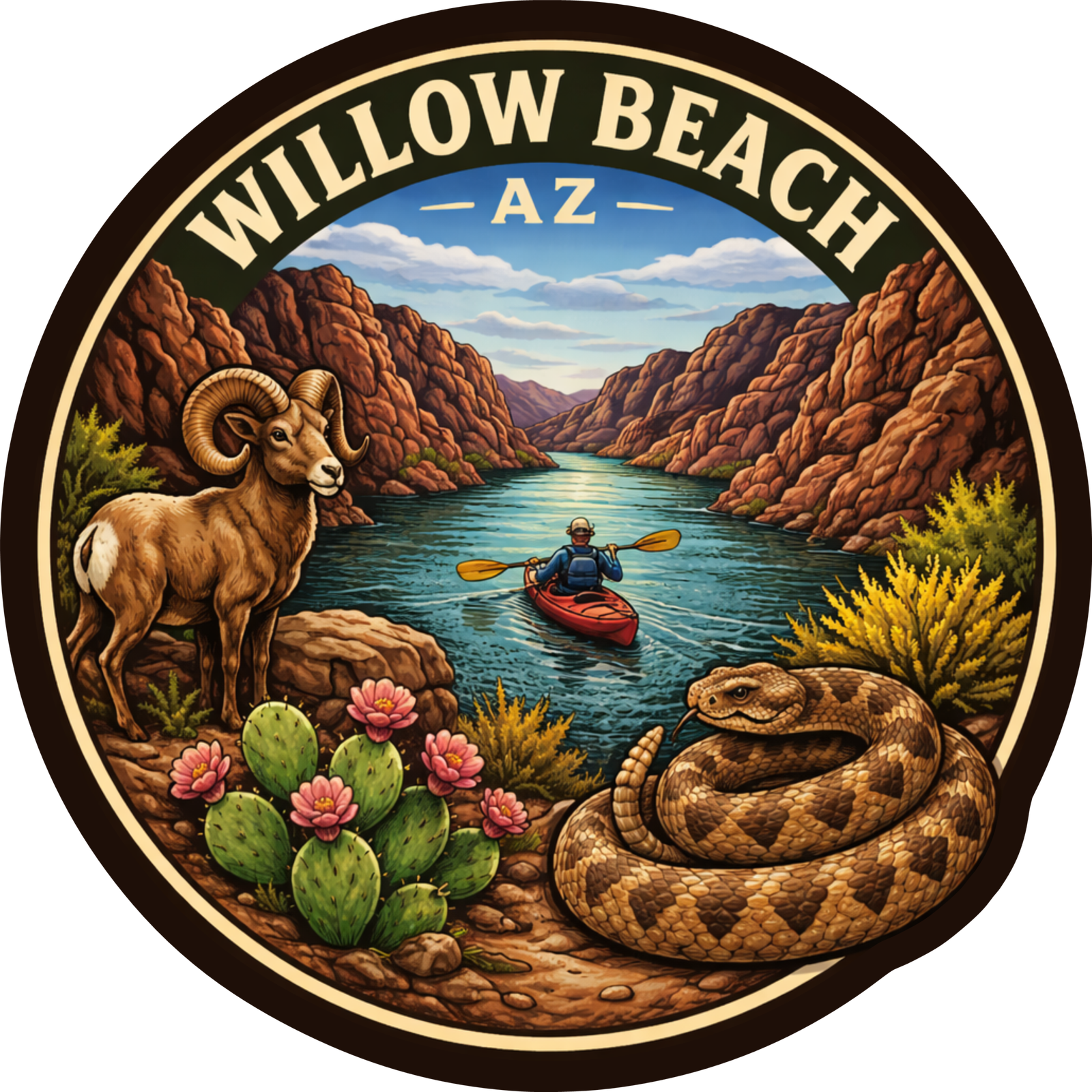 This one captures the full Willow Beach experience. From the canyon walls and river to the bighorn sheep, rattlesnake, and kayaker, every detail brings the scene to life.