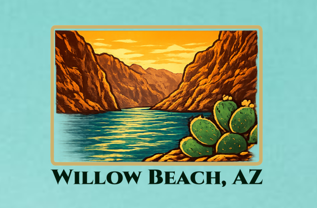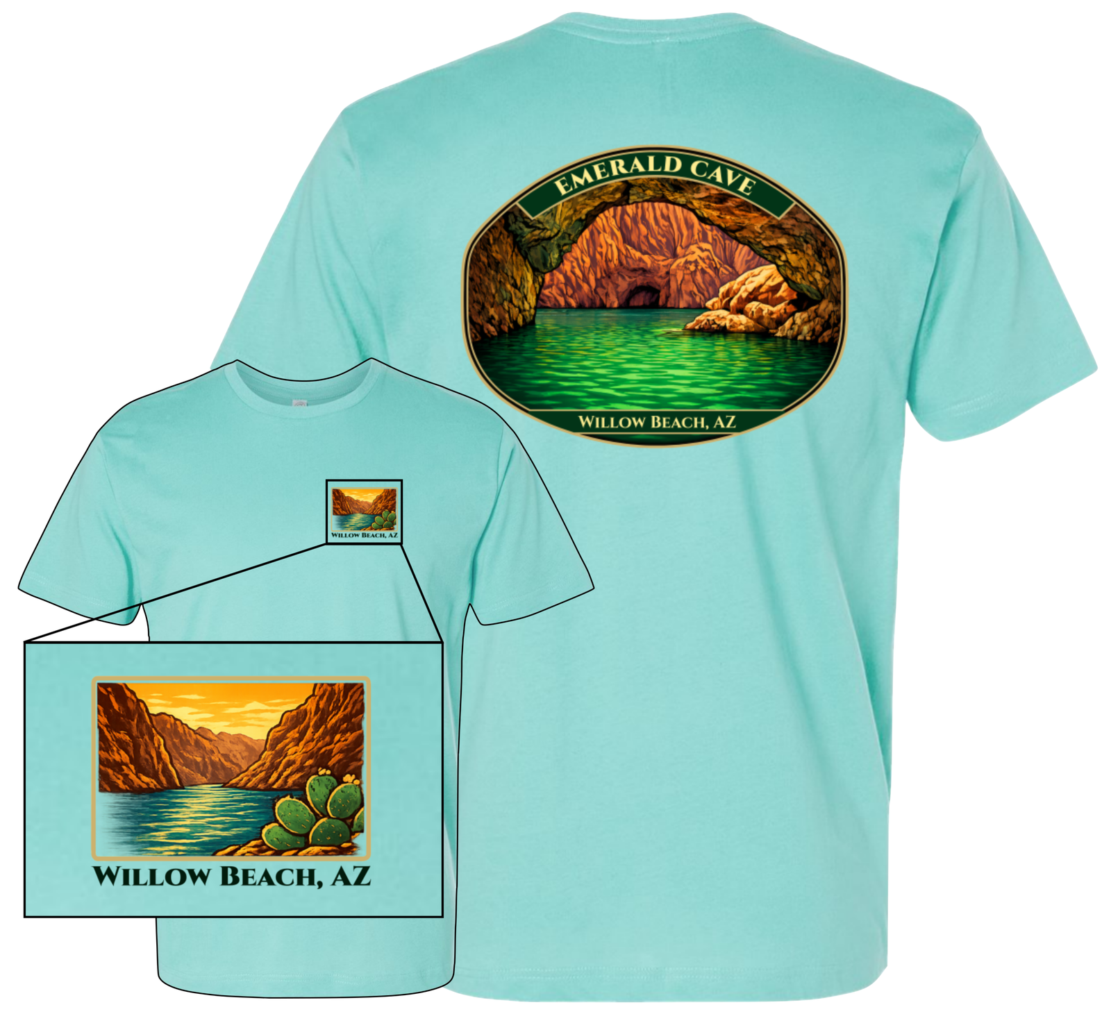 Front and back graphic representing Emerald Cave and Willow Beach, AZ